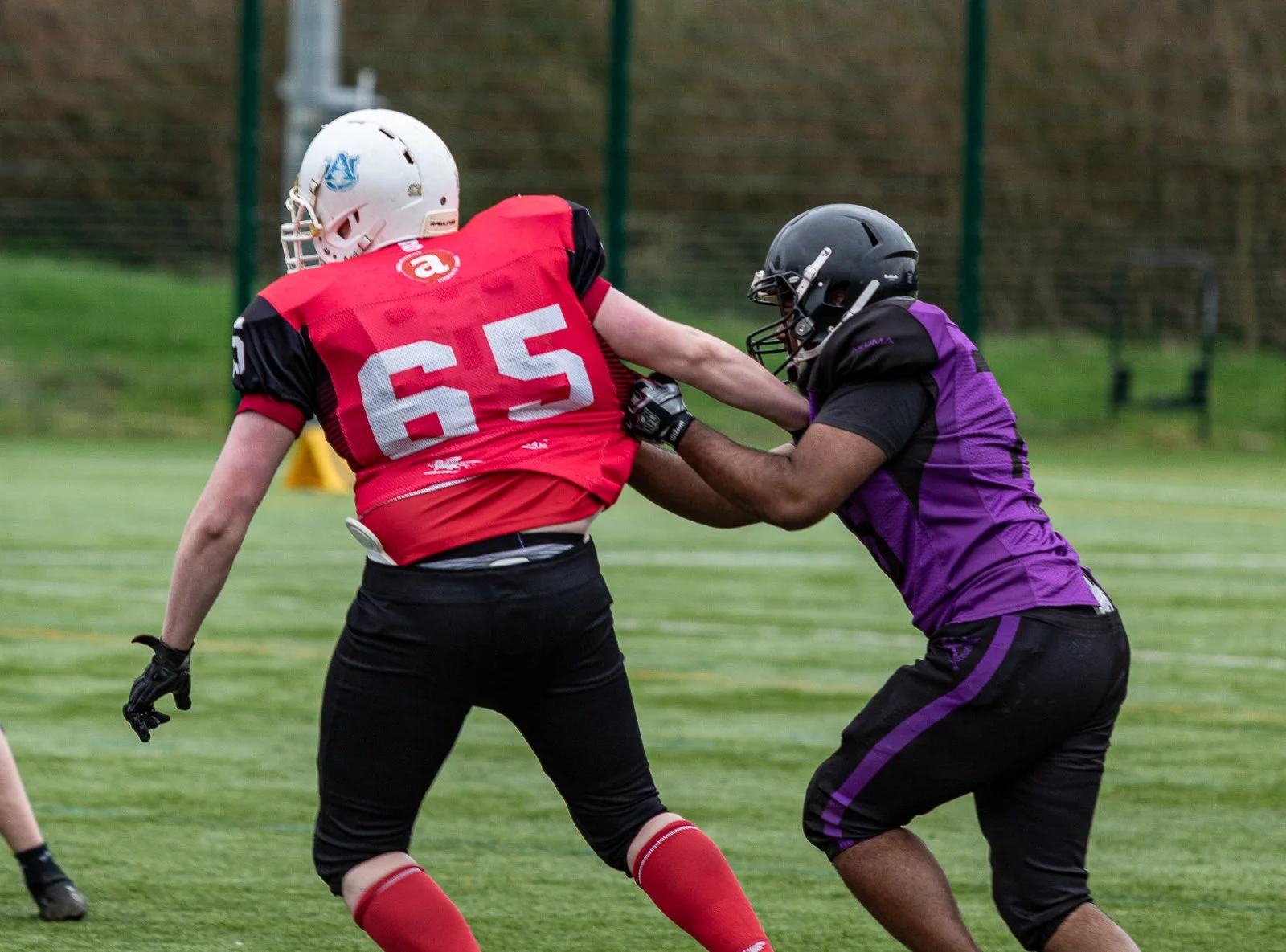Two football players in a game: one in a red jersey with number 65 and a white helmet, the other in a purple and black jersey with a black helmet, engaged in a tackling play on a grassy field.