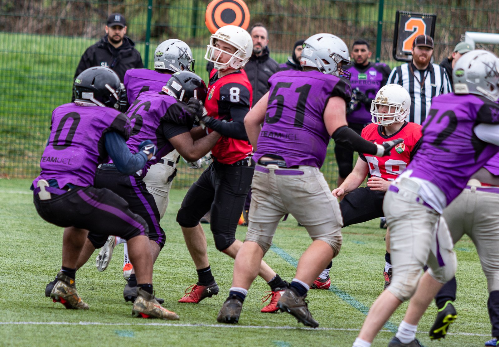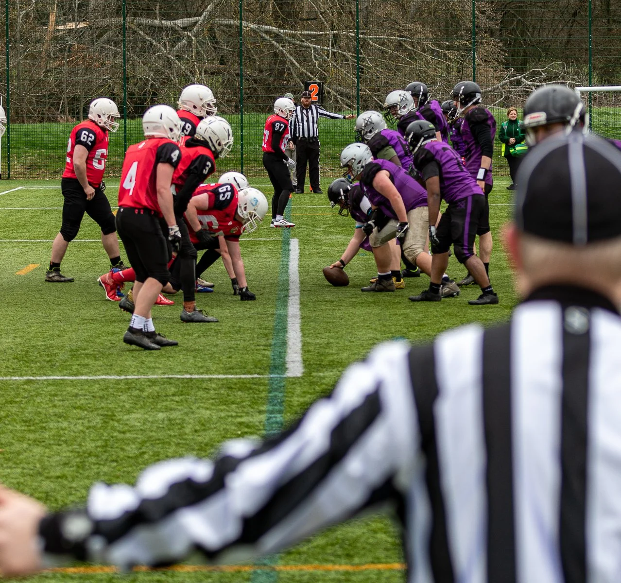 American football game in progress with players in purple and red jerseys engaging in a play on a green field. Referee observing on the right.