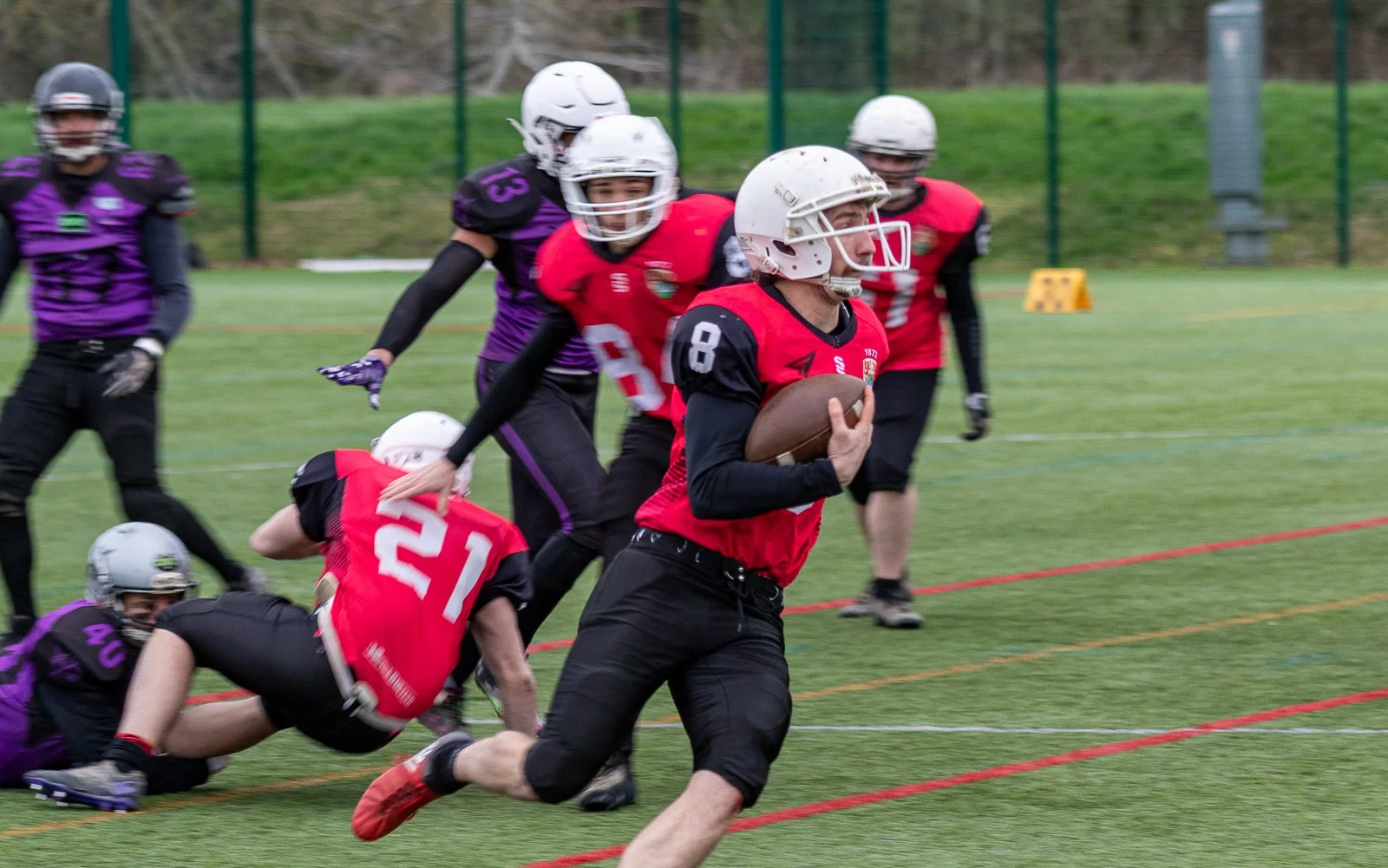 An American football game with players on a green field, some wearing red jerseys and others wearing purple and black uniforms, with one player in a red jersey holding the football.