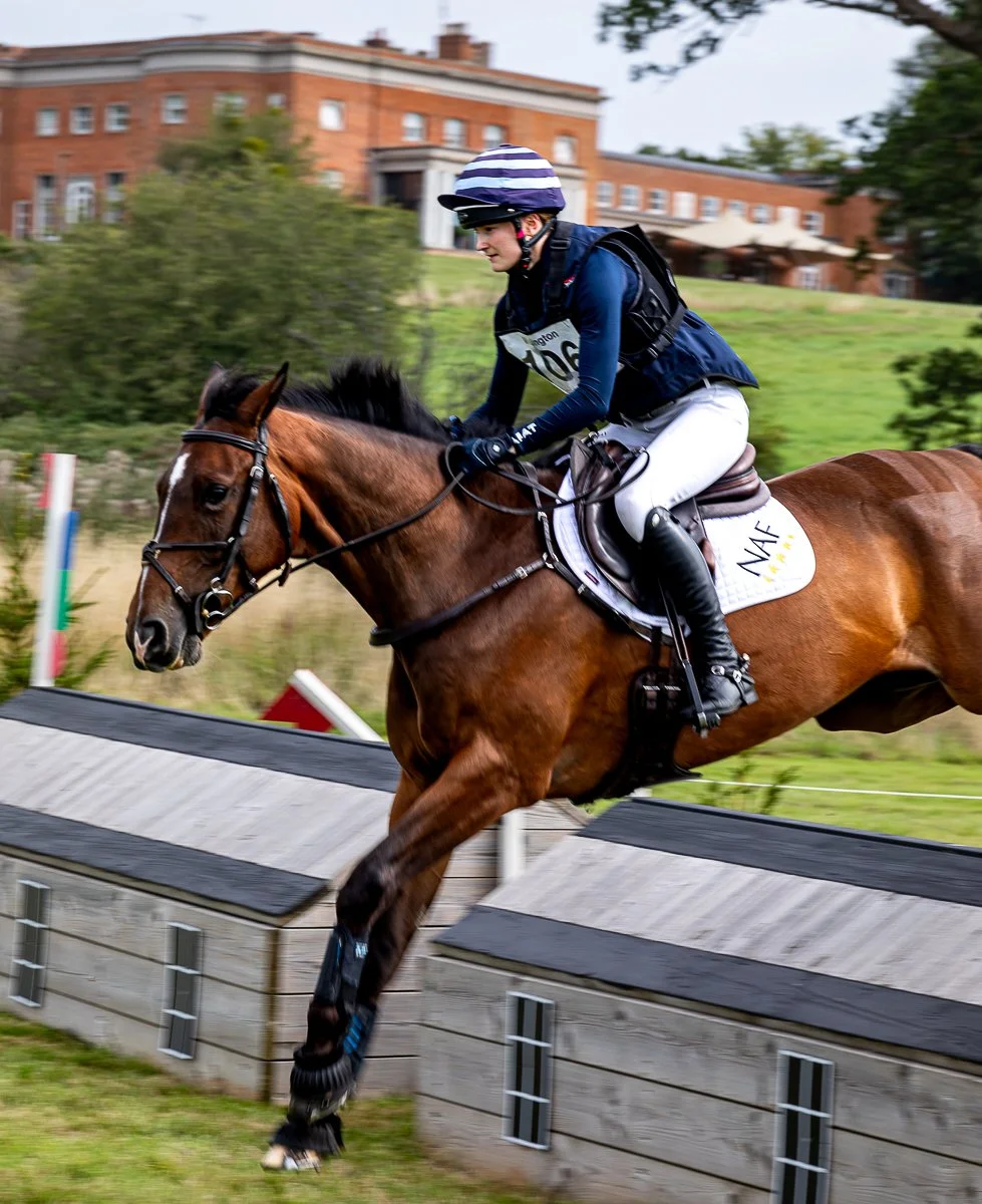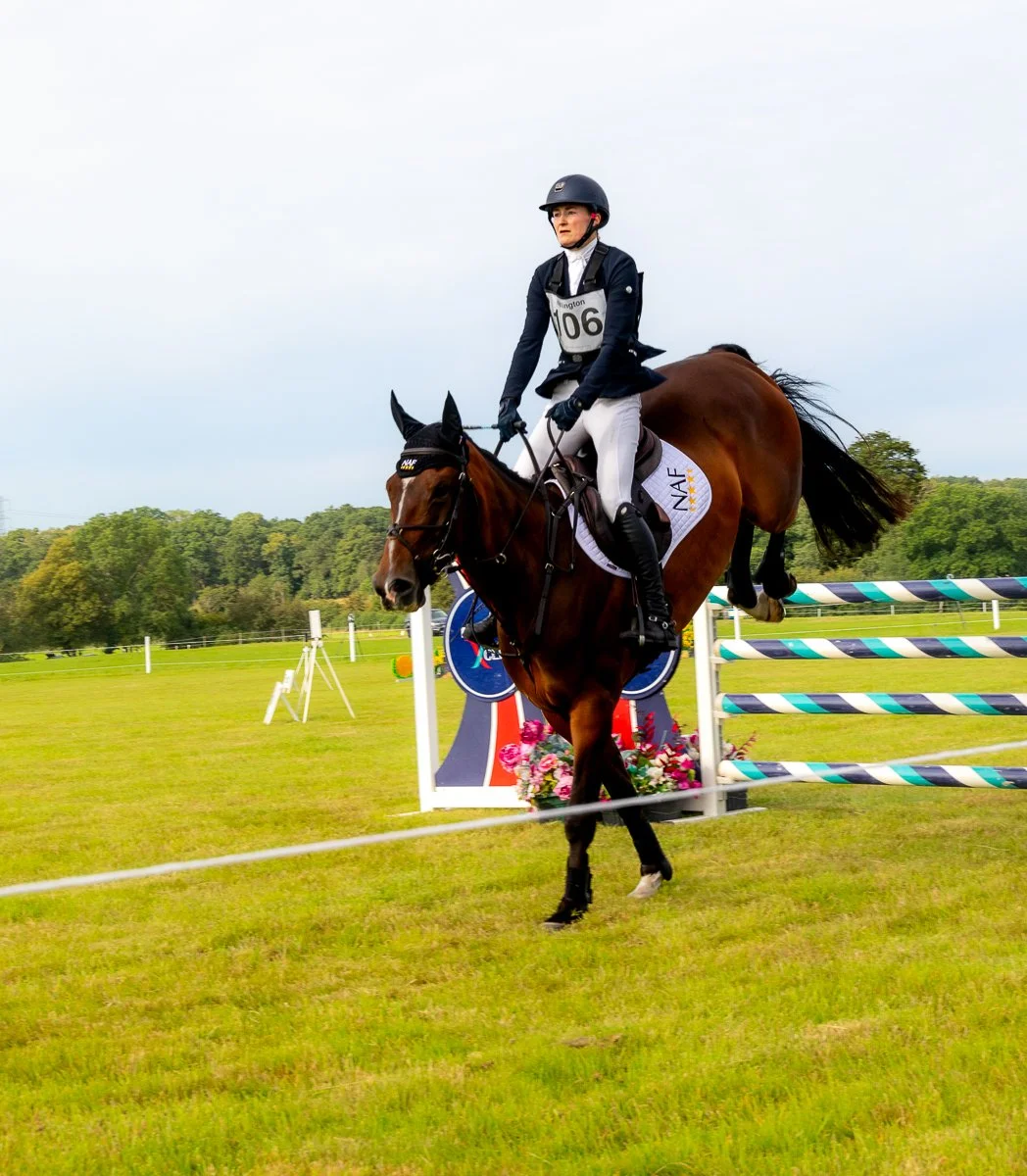 A female equestrian rider competing in a cross-country event, riding a dark horse on a grassy field with obstacles and trees in the background.
