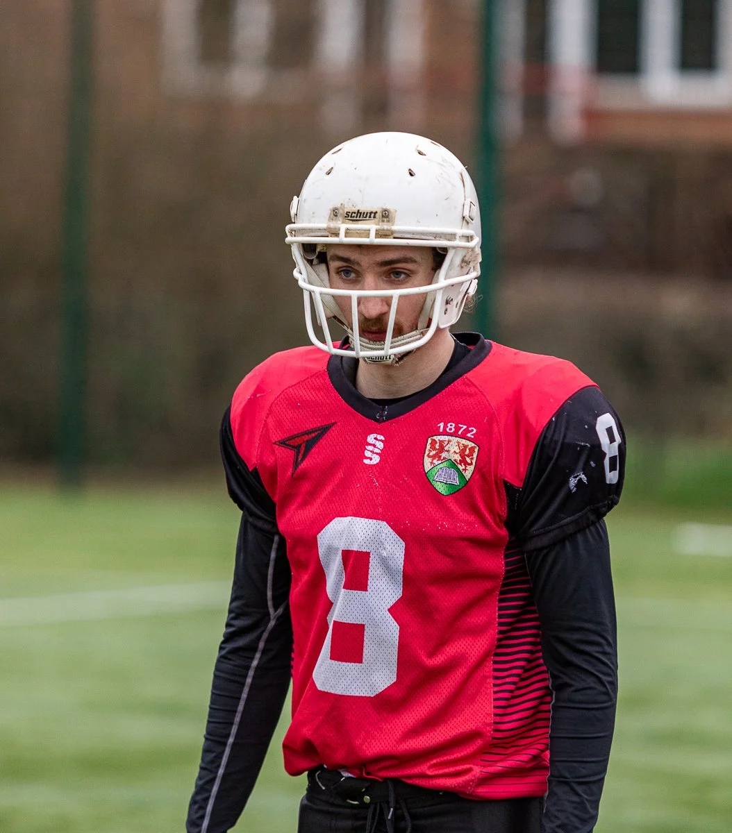 A football player wearing a red jersey with the number 3, black sleeves, and a white helmet, standing on a grassy field.