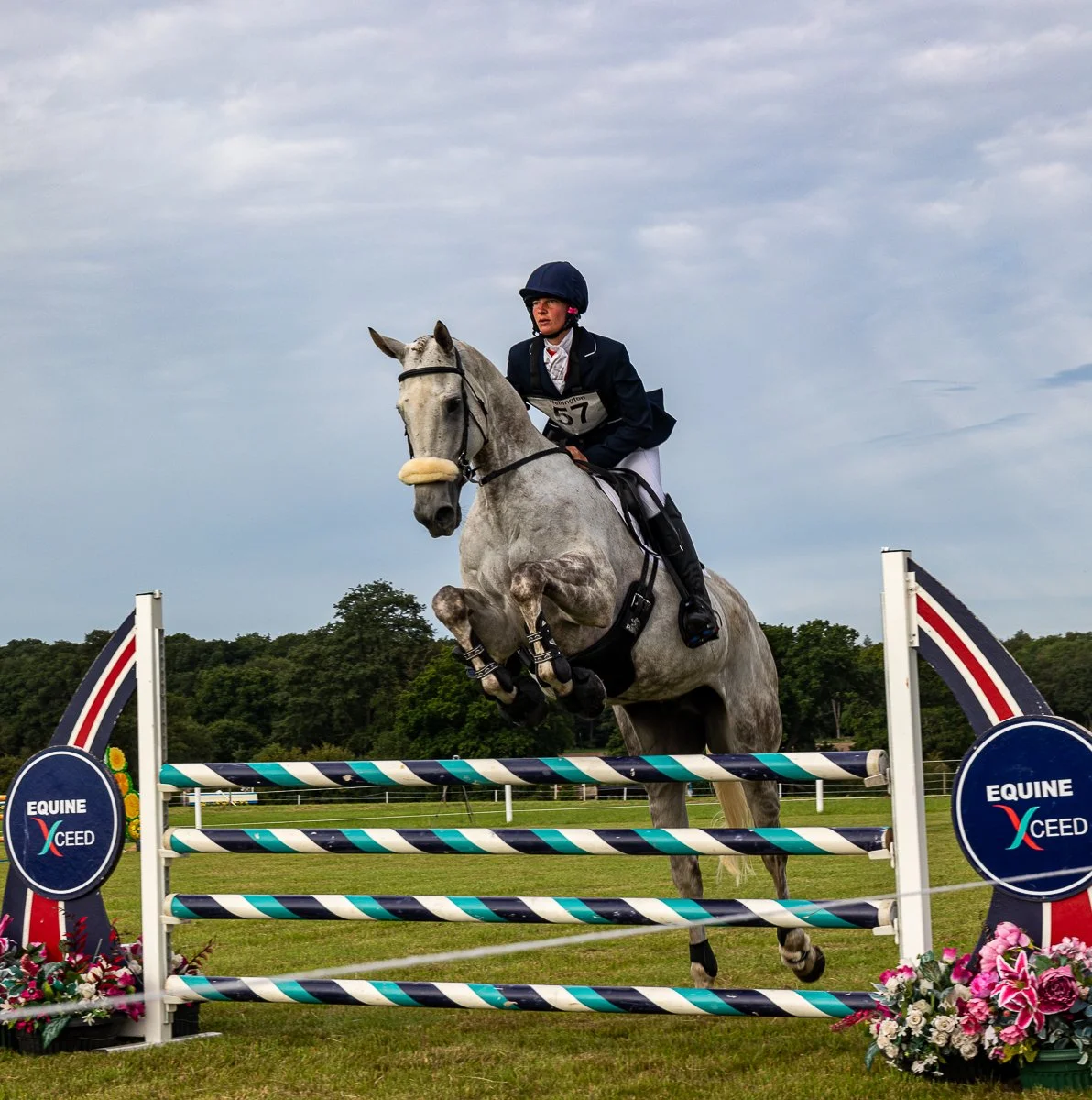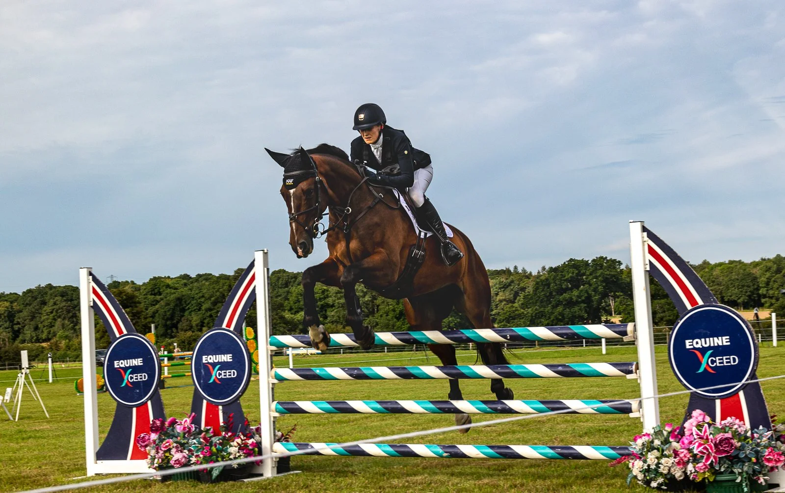 A rider on a brown horse jumping over a red, white, and blue show jumping obstacle labeled 'EQUINE X CEED' at an outdoor equestrian event, with greenery and trees in the background.