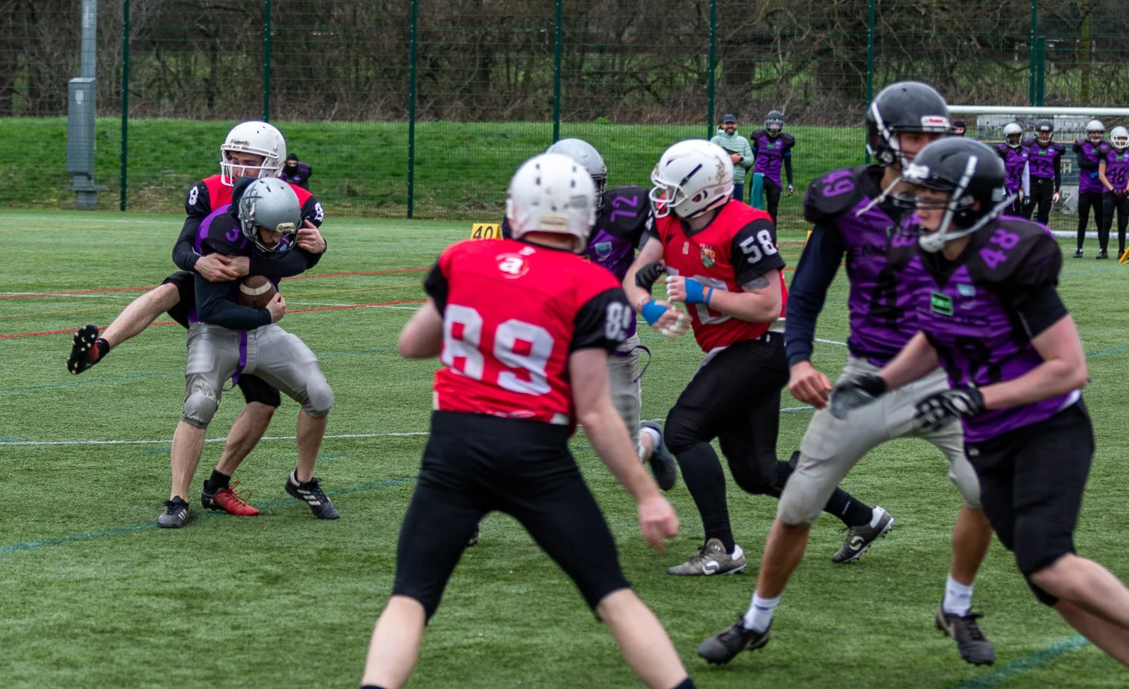 American football players in red and purple uniforms during a game, with one player in red holding the football while being tackled by a player in purple, on a grassy field with some team members and spectators in the background.