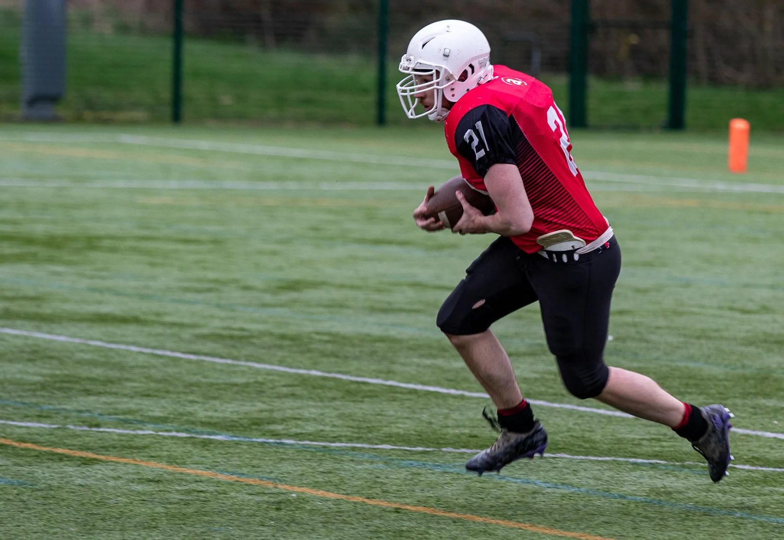 A football player wearing a white helmet, red jersey, and black pants running on a grassy field while holding a football.