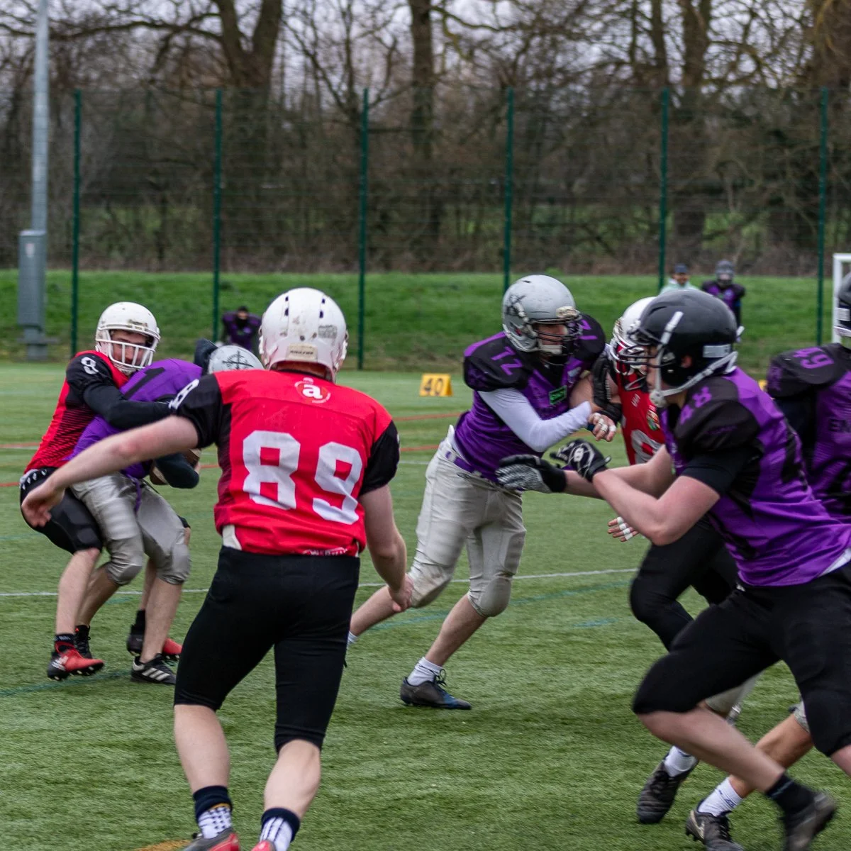 A group of football players during a game, with one player in a red jersey running with the ball and others in purple and red jerseys trying to stop him on a grassy field.