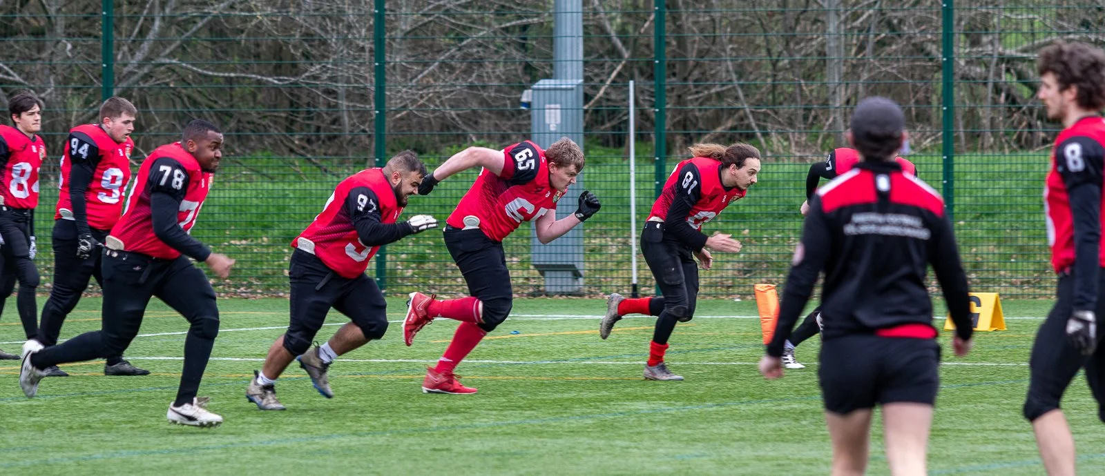 American football players in red and black uniforms during a game on a grassy field, with one player running with the ball and others blocking.